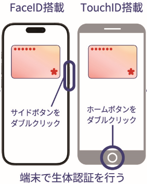 iPhoneの場合はサイドボタンをダブルタップし、端末上で生体認証を行う。