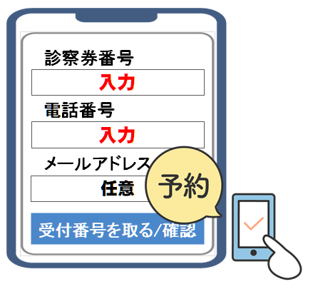 - スマホ(PC)から、再診の受付・順番予約が出来、おおよその待ち人数がわかります。